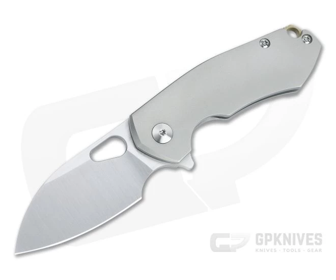 The GiantMouse Riv, named after a historic East Lansing, MI dive bar near GiantMouse H.Q., is a refinement of the Biblio design in a more compact and high performance package. Built on a robust, titanium frame lock construction, this flipper offers a razor sharp daily carry that can tackle all but the largest of tasks. This version comes with a satin finished Elmax blade and blasted matte gray titanium handles with brass back spacer.