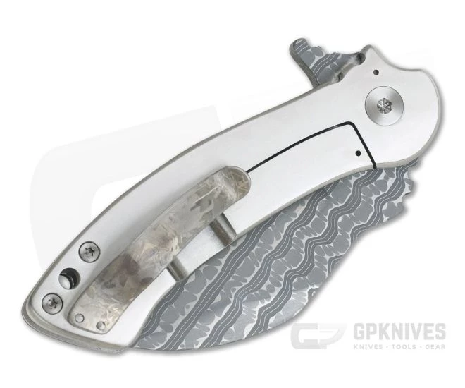 The Grindhouse Knives TMAx Flipper designed and built by Sam Jones is a bit thicker and beefier than the TMA delivering a compact yet seriously robust folder. A long flipper tab, hefty blade and ball bearing pivot deliver ultra-fast deployment with tank like lock up afforded by the titanium frame lock. This version comes with a striking Chad Nichols Stainless Iguana pattern Damascus blade, Carbon Fiber handle scale and satin finished titanium liner and frame.