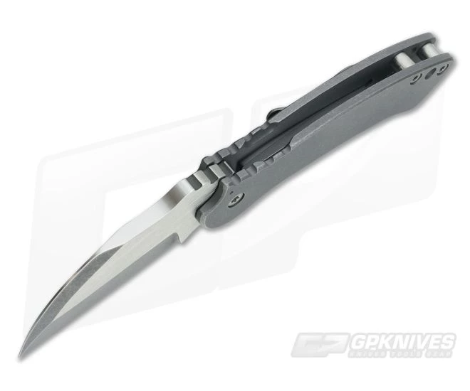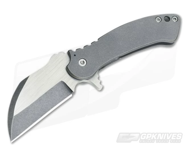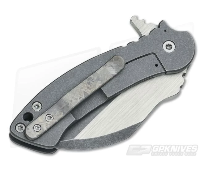 The Handle:Â Two .125 inch thick titanium slabs, a little slimmer, with a snazzy acid washed finish to match the blade grinds. Simple design on the TMA that snags the beginning and end of your grip well. Solid, early frame lock up. Construction consists of satin titanium hardware with open standoffs and a slim silver unob titanium pocket clip for tip up carry. The number 20 can be seen inside both the handle slabs near the pivot.