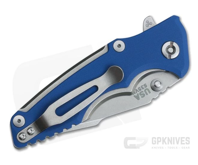 Handle:Â The handle sports the same fantastic ergonomics of the full-size Eklipse in a more compact platform. The finger grooves, shape and texturing fit the hand like a glove. It’s a harmoniously ergonomic experience designed with comfort in mind. This version is dressed in Blue G10 secured to titanium liners with an open back construction. Titanium Torx hardware and barrel spacers round out the construction.