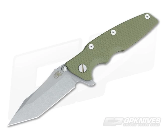 Generation 2 Working Finished Harpoon Tanto Eklipse Flipper from Rick Hinderer Knives sporting an OD Green G10 handle scale and premium CPM 20CV blade steel. This second gen has a larger overall frame than the first gen allowing for a wider variety of blade styles. This one, in particular, is ground to a Harpoon Tanto style razor sharp with a Working Finish.