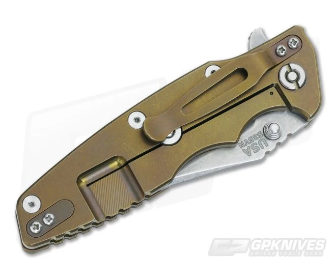 The Handle:Â The same Gen 1 stylings you love on just a bit larger platform. The finger grooves, shape and texturing fit the hand like a glove. It’s a harmoniously ergonomic experience designed with comfort in mind. This version is dressed in black and tan layered G10 secured to a bronze titanium liner with a Battle Bronze titanium frame locker on the back. All the standard Hinderer features are present from the Lockbar Stabilizer to open construction and a Ti pocket clip that can be flipped to tip up carry.Â