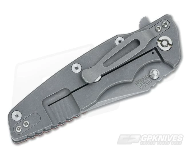 The Handle:Â The same Gen 1 stylings you love on just a bit larger platform. The finger grooves, shape and texturing fit the hand like a glove. It’s a harmoniously ergonomic experience designed with comfort in mind. This version is dressed in a blended orange/black G10 scale secured to a Working Finish titanium liner with a matching Working Finished titanium frame locker on the back. All the standard Hinderer features are present from the Lockbar Stabilizer to open construction and a Ti pocket clip that can be flipped to tip up carry.Â