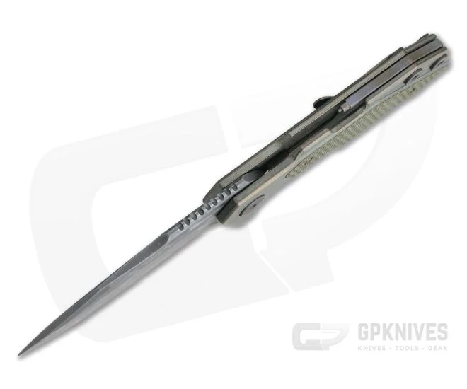 Handle:Â A thick slab of anodized, Battlefield Pickup finished titanium is precision machined patinated with pits and scratches. An integral frame lock mechanism equipped with a steel lock face insert delivers smooth, reliable operation and secure lock up. Dual, OD Green G10 inlays offer added traction and reduce the weight of the knife for excellent carry. The open back construction offers a modular build with two titanium barrel spacers and the detent equipped H.M.B.S. tool which allows for adjustment off all the Full Track’s hardware. Now you can adjust your pivot or disassemble the knife for field maintenance at any time.