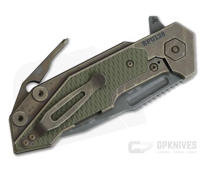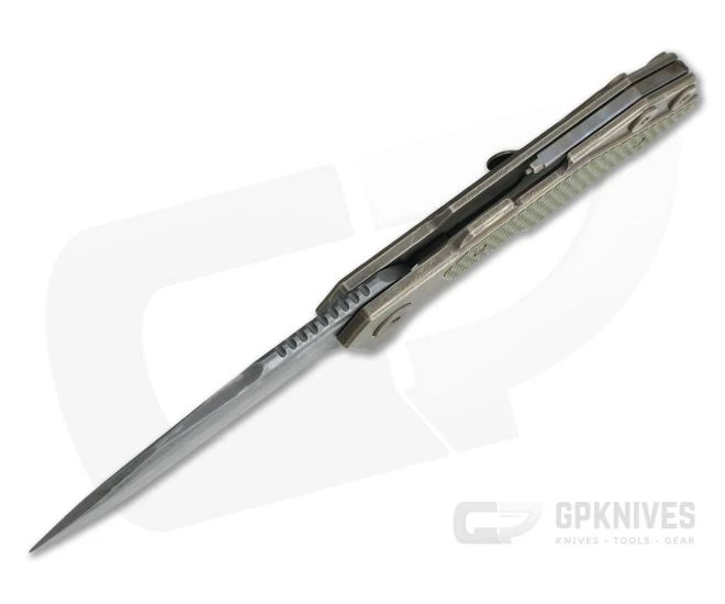 Handle:Â A thick slab of anodized, Battlefield Pickup finished titanium is precision machined patinated with pits and scratches. An integral frame lock mechanism equipped with a steel lock face insert delivers smooth, reliable operation and secure lock up. Dual, OD Green G10 inlays offer added traction and reduce the weight of the knife for excellent carry. The open back construction offers a modular build with two titanium barrel spacers and the detent equipped H.M.B.S. tool which allows for adjustment off all the Full Track’s hardware. Now you can adjust your pivot or disassemble the knife for field maintenance at any time.