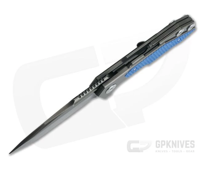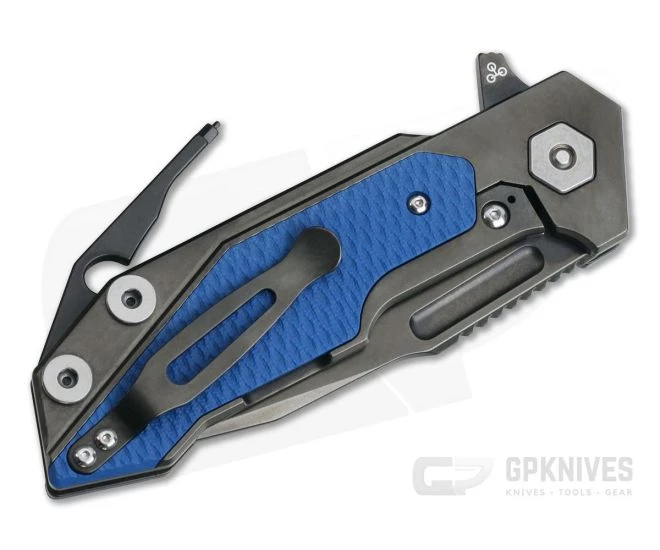 Handle:Â A thick slab of Stonewashed Black DLC finished titanium is precision machined with a smooth finish and an integral frame lock mechanism equipped with a steel lock face insert for smooth, reliable operation. Dual Blue G10 inlays offer added traction and reduce the weight of the knife for excellent carry. The open back construction offers a modular build with two titanium barrel spacers and the detent equipped H.M.B.S. tool which allows for adjustment off all the Full Track’s hardware. Now you can adjust your pivot or disassemble the knife for field maintenance at any time.