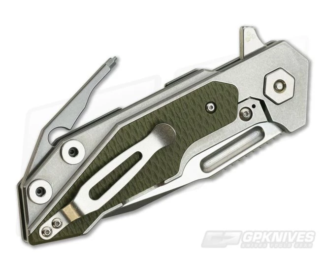 Handle:Â A thick slab of titanium is precision machined with a smooth finish and an integral frame lock mechanism equipped with a steel lock face insert for smooth, reliable operation. Dual OD Green G10 inlays offer added traction and reduce the weight of the knife for excellent carry. The open back construction offers a modular build with two titanium barrel spacers and the detent equipped H.M.B.S. tool which allows for adjustment off all the Full Track’s hardware. Now you can adjust your pivot or disassemble the knife for field maintenance at any time.