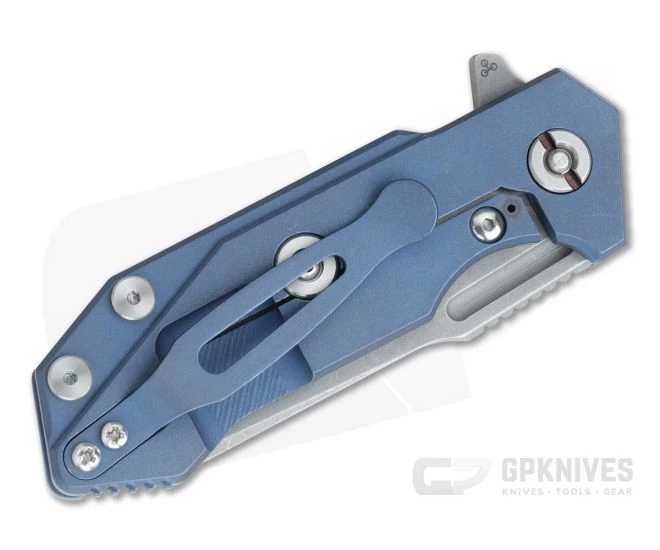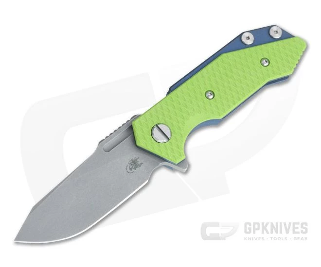 This version has a blasted and tumbled “Working Finish”, Slicer Grind, 20CV blade, Neon Green G10 front scale and Battle Blue titanium frame.