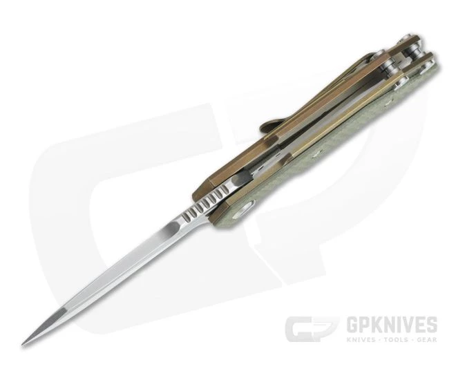 This version has a stonewashed, Slicer Grind, 20CV blade, OD Green G10 front scale and stonewashed Bronze titanium frame.