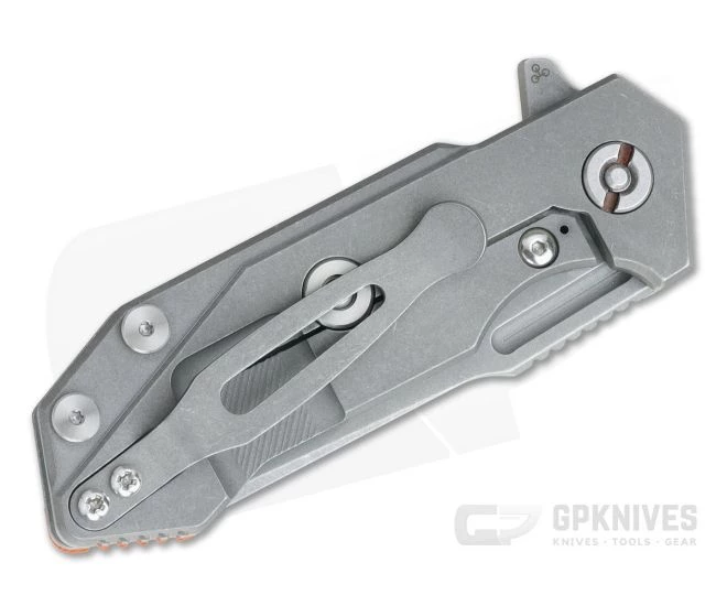 This version has a blasted and tumbled “Working Finish”, Slicer Grind, 20CV blade, Orange G10 front scale and matching Working Finish titanium frame.