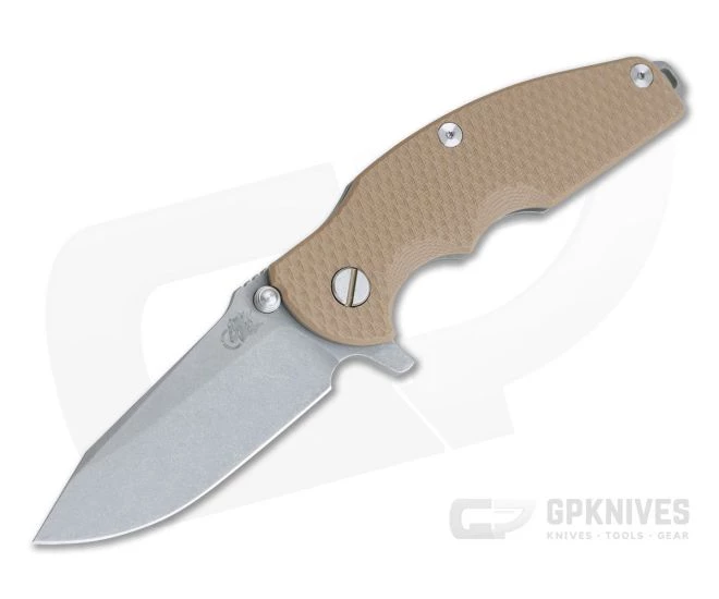 Handle:Â The full titanium frame lock side and liner have a matching Working Finish with the show side dressed in an “XM” textured Coyote Tan G10 handle scale. The ergonomics are fantastic with dual finger grooves on the bottom and a nice scoop to rest your thumb on the top. Construction on the Jurassic features a single barrel spacer midway down the spine with a Lanyard Loop H.M.B.S. (Hinderer Modular Back-spacer System) and LockBar Stabilizer.