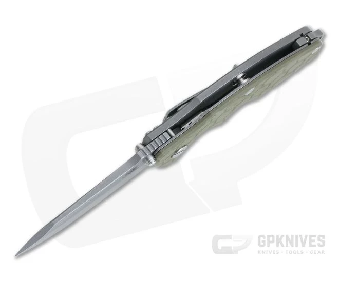 Handle:Â The full titanium frame lock side and liner have a matching Working Finish with the show side dressed in a reptile “Scaled’ textured OD Green G10 handle scale. The ergonomics are fantastic with dual finger grooves on the bottom and a nice scoop to rest your thumb on the top. Construction on the Jurassic features a single barrel spacer midway down the spine with a Lanyard Loop H.M.B.S. (Hinderer Modular Back-spacer System) and LockBar Stabilizer.