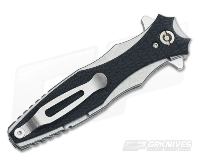 The Handle: The frame is fully stonewashed titanium built with finger grip comfort in mind. The genius is both sides are machined in the same fashion giving its user the same, reliable grip every time no matter which hand the Maximus is in. Speaking of grip, Hinderer added a Black G10 onlay to both sides of the frame creating a usable accent. Construction consists of a single brass standoff at the end of the handle. Also included is a tip up carry titanium pocket clip that can be flipped to either side with tab insert.