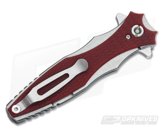 The Handle:Â The frame is fully stonewashed titanium built with finger grip comfort in mind. The genius is both sides are machined in the same fashion giving its user the same, reliable grip every time no matter which hand the Maximus is in. Speaking of grip, Hinderer added a Red G10 onlay to both sides of the frame creating a usable accent. Construction consists of a single satin Ti standoff at the end of the handle. Also included is a tip up carry titanium pocket clip that can be flipped to either side with tab insert.Â