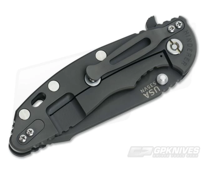 The Handle: Â Full titanium frame lock and liner have have also been black DLC finished. Hardware and standoffs create one tough package while 3D texturing on the G-10 scale coupled with jimping all around offer a solid grip. There is a bit of a choil to choke up on the blade for more detailed cutting tasks as well. This Hinderer XM-18 includes the famous Hinderer Lockbar Stabilizer and two-position titanium clip for tip up or down right hand carry.