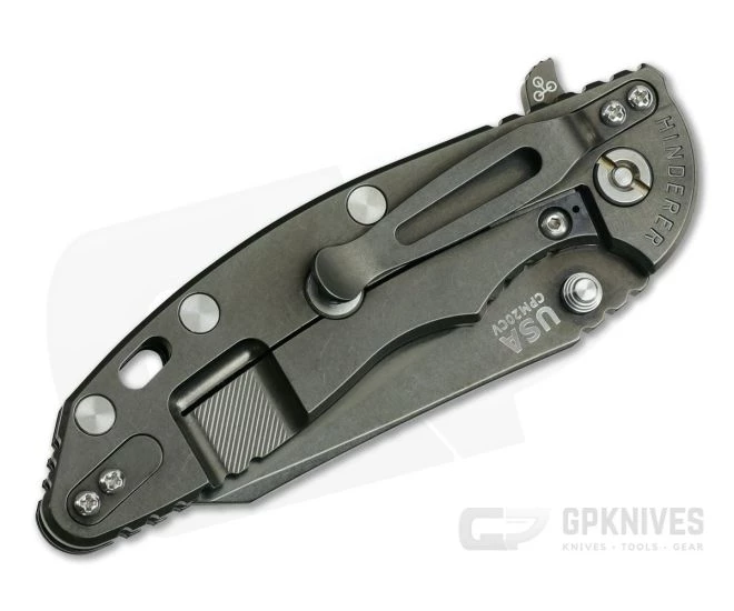 Tri-Way Pivot:Â The newest innovation from Rick Hinderer, the Tri-Way pivot features milled pockets in the blade and frame allowing for the use of ball bearing pivot washers (installed) or, utilizing steel spacers to fill those pockets, you can use either of the included sets of nylon or bronze washers to customize the action and operation of your knife.