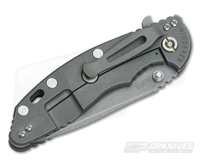 The Handle: Â Full titanium frame lock and liner are outfitted with the Working Finish to match the blade. Hardware and standoffs create one solid package while 3D texturing on the G-10 scale coupled with jimping all around create a solid grip. There is also a bit of a choil to choke up on the blade for more detailed cutting tasks as well. This Hinderer XM-18 includes the famous Hinderer Lockbar Stabilizer and two-position Working Finish titanium clip and insert for tip up or down right hand carry.