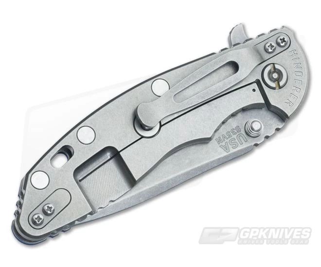 The Handle: Â Full titanium frame lock and liner have a heavily tumbled finish. Hardware and standoffs create one tough package while 3D texturing on the G-10 scale coupled with jimping all around create a solid grip. There is a bit of a choil to choke up on the blade for more detailed cutting tasks as well. This Hinderer XM-18 includes the famous Hinderer Lockbar Stabilizer and two-position titanium clip and insert for tip up or down right hand carry.