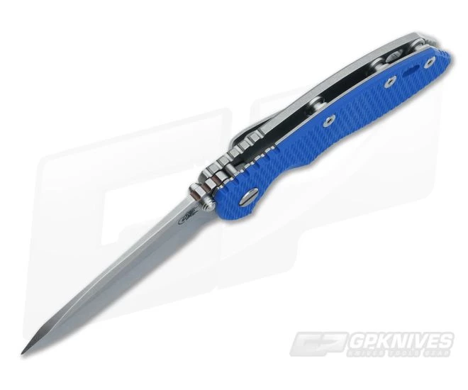 The Blade:Â Â The three and a half inch blade is stonewashed and can be opened via the integral flipper or dual thumb studs/blade stops. Rick’s own 17-4PH state-of-the-art pivot system creates silky smooth operation; however, a bit of wrist action may be needed for flipping as Hinderers often have a light detent. Â