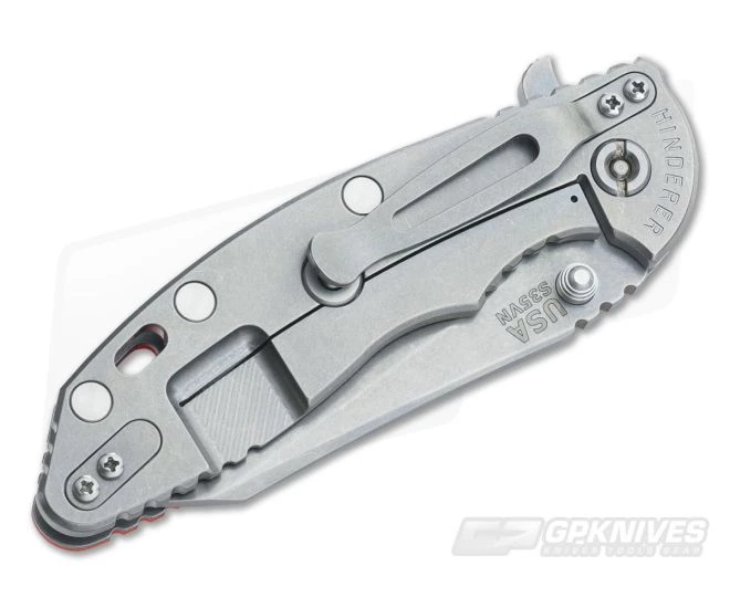 The Handle: Â Full titanium frame lock, liner, hardware and standoffs create one tough package while 3D texturing on the G-10 scale coupled with jimping all around create a solid grip. There is a bit of a choil to choke up on the blade for more detailed cutting tasks as well. This Hinderer XM-18 includes the famous Hinderer Lockbar Stabilizer and two-position titanium clip for tip up or down right hand carry.