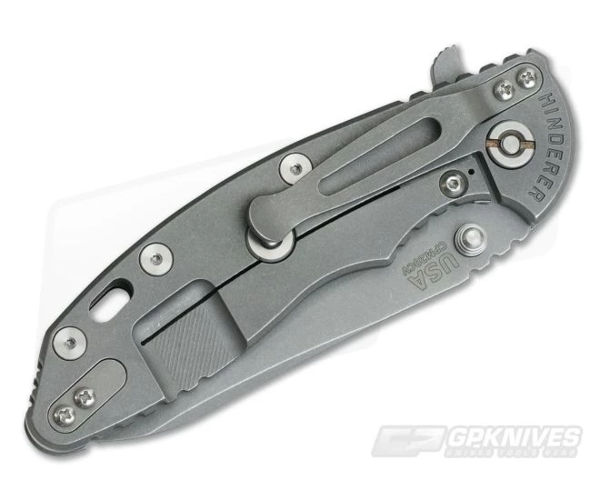 The Handle: Â Full titanium frame lock and liner have a matching Working Finish that is rugged and hides wear well while reducing reflectivity. Satin Hardware and standoffs create one solid package while 3D texturing on the Black G10 scale coupled with jimping all around create a solid grip. There is also a bit of a choil to choke up on the blade for more detailed cutting tasks as well. This Hinderer XM-18 includes the famous Hinderer Lockbar Stabilizer and two-position Working Finish titanium clip and insert for tip up or down right hand carry.