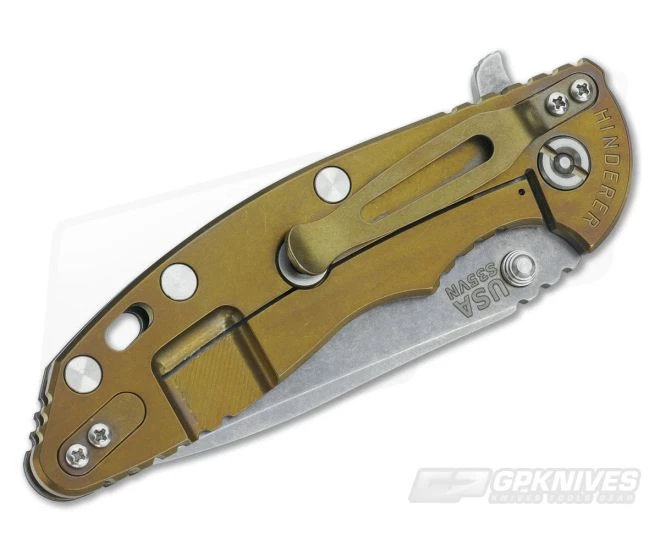 The Handle: Full titanium frame lock and liner have a Battle Bronze finish. This finish utilizes Hinderer’s stonewashing technique with a pop of Bronze anodization. It’s one tough battle-tested finish that will last. Hardware and standoffs create a solid package while 3D texturing on the G-10 scale coupled with jimping all around create a solid grip. There is a bit of a choil to choke up on the blade for more detailed cutting tasks as well. This Hinderer XM-18 includes the famous Hinderer Lockbar Stabilizer and two-position Battle Bronze titanium clip for tip up or down right hand carry.