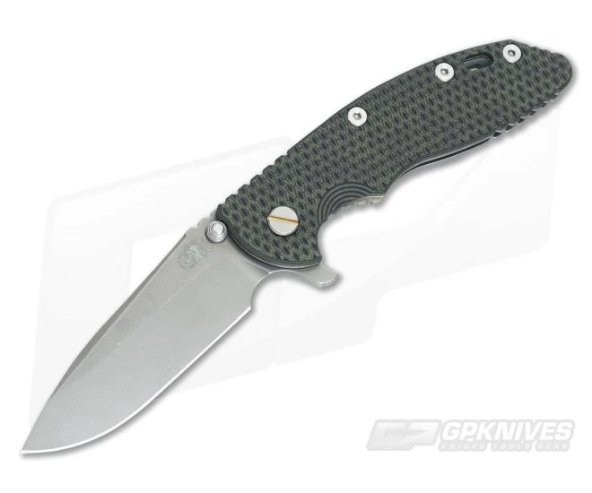 The Blade:Â Â The three and a half inch blade is Battle Anthracite DLC finished and can be opened via the integral flipper or dual thumb studs/blade stops. Rick’s own 17-4PH state-of-the-art pivot system creates silky smooth operation; however, a bit of wrist action may be needed for flipping as Hinderers often have a light detent. Â