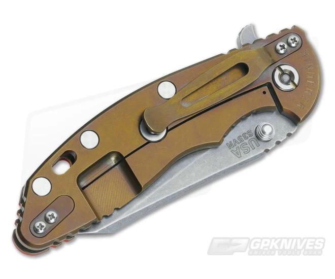 The Handle: Full titanium frame lock and liner have a Battle Bronze finish. This finish utilizes Hinderer’s stonewashing technique with a pop of Bronze anodization. It’s one tough battle-tested finish that will last. Hardware and standoffs create one tough package while 3D texturing on the G-10 scale coupled with jimping all around create a solid grip. There is a bit of a choil to choke up on the blade for more detailed cutting tasks as well. This Hinderer XM-18 includes the famous Hinderer Lockbar Stabilizer and two-position titanium clip for tip up or down right hand carry.