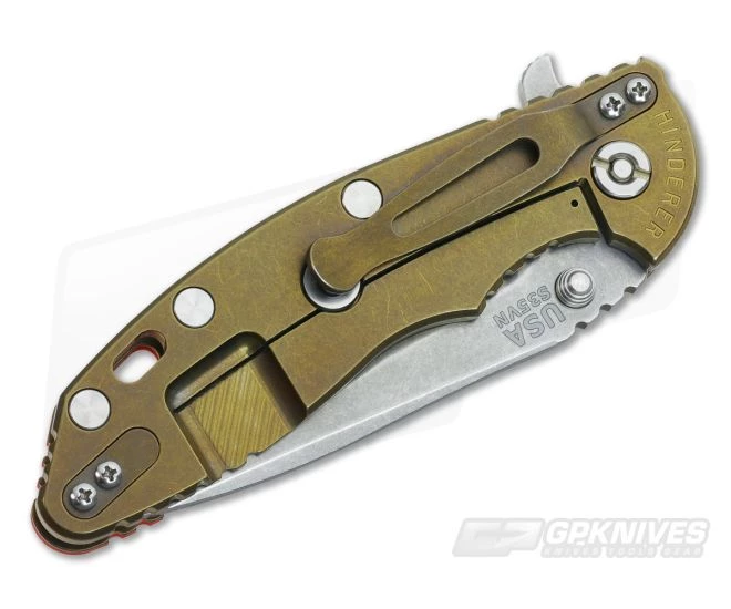 The Handle: Â Full titanium frame lock and liner have a Battle Bronze finish. This finish utilizes Hinderer’s stonewashing technique with a pop of Bronze anodization. It’s one tough battle-tested finish that will last. Hardware and standoffs create one tough package while 3D texturing on the G-10 scale coupled with jimping all around create a solid grip. There is a bit of a choil to choke up on the blade for more detailed cutting tasks as well. This Hinderer XM-18 includes the famous Hinderer Lockbar Stabilizer and two-position Battle Bronze titanium clip and insert for tip up or down right hand carry.