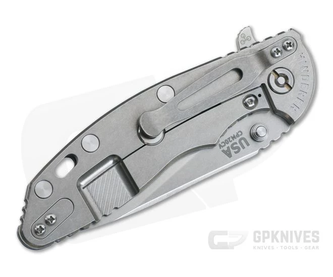 Handle:Â Full titanium frame lock and liner have a matching Stonewashed finish that is rugged and hides wear well while still having a handsome appeal. Satin Hardware and standoffs create one solid package while 3D texturing on the G10 scale coupled with strategic jimping provide a secure grip. An index finger choil allows you to choke up on the blade for more detailed cutting tasks as well. This Hinderer XM-18 includes the famous Hinderer Lockbar Stabilizer and two-position titanium clip and insert for tip up or down, right-hand carry.