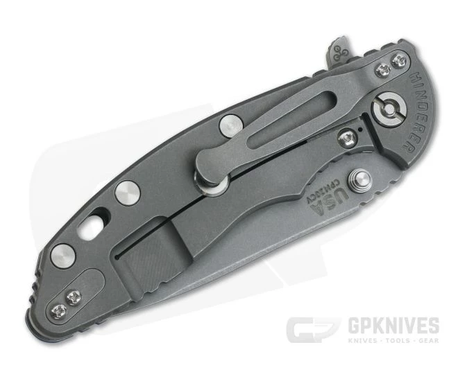 Blade:Â Â The three and a half inch blade opens fast and smooth via the integral flipper or dual thumb studs/blade stops. The CPM 20CV blade delivers optimum edge retention and corrosion resistance and sports Hinderer’s Working Finish, blasted and tumbled for a non-reflective and wear hiding finish. Rick’s own Tri-Way pivot system creates silky smooth operation with your choice of bearings, nylon or bronze washers. The detent is dialed in for decisive flipper deployment.