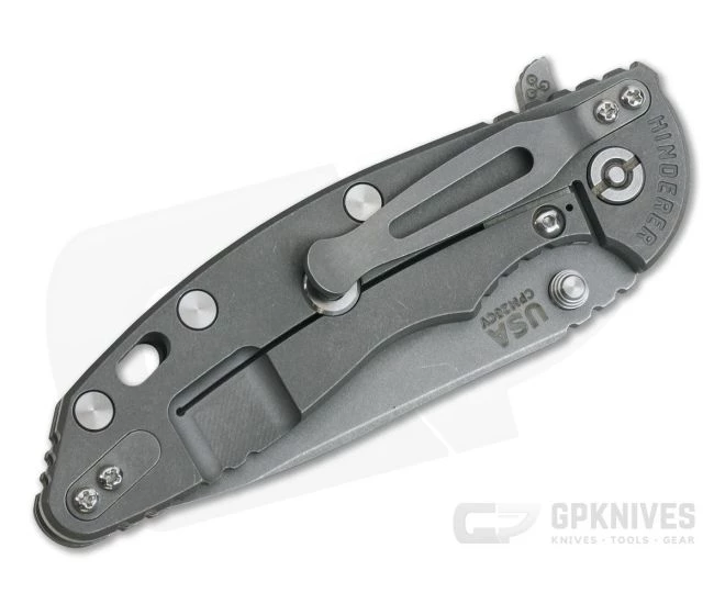 Blade:Â Â The three and a half inch blade opens fast and smooth via the integral flipper or dual thumb studs/blade stops. The CPM 20CV blade delivers optimum edge retention and corrosion resistance and sports Hinderer’s Working Finish, blasted and tumbled for a non-reflective and wear hiding finish. Rick’s own Tri-Way pivot system creates silky smooth operation with your choice of bearings, nylon or bronze washers. The detent is dialed in for decisive flipper deployment.