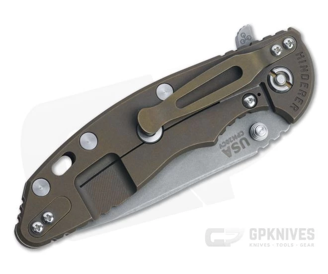 Handle:Â Full titanium frame lock and liner are finished in Battle Bronze* for a rugged, wear hiding look with subdued visual appeal. Satin hardware and standoffs create one solid package, while a 3D textured G10 scale and strategically placed jimping provide a solid grip. The Hinderer LockBar Stabilizer, titanium clip insert and hardware make this a fully customizable modular design.