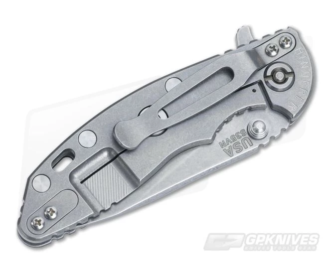The Handle: Â Full titanium frame lock and liner have been stonewashed as well to match the blade. This finish works great for intended hard-use as it already looks “worn” or “broken in”…and cool. So, no-worry wear as you won’t be able to tell. Hardware and standoffs create one tough package while 3D texturing on the G-10 scale coupled with jimping all around create a solid grip. There is a bit of a choil to choke up on the blade for more detailed cutting tasks as well. This Hinderer XM-18 includes the famous Hinderer Lockbar Stabilizer and two-position titanium clip for tip up or down right hand carry.