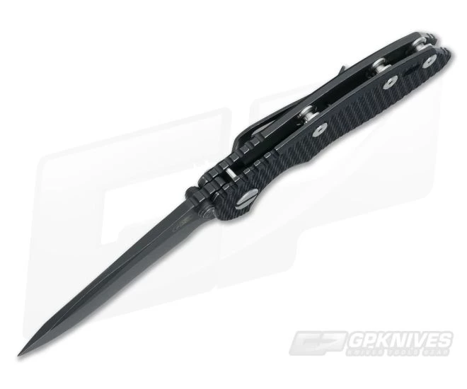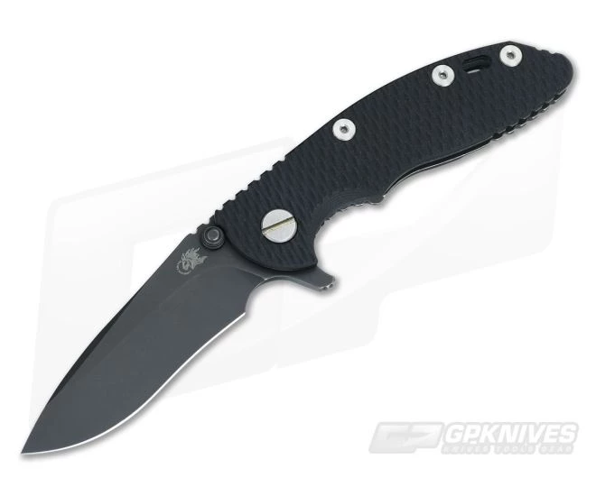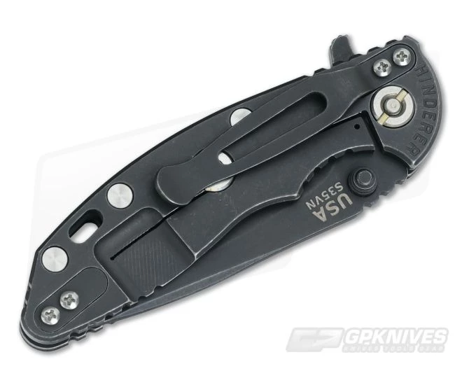 The Blade:Â Â The three inch blade has a Battle Black DLC finish and can be opened via the integral flipper or dual thumb studs/blade stops. This one hides the wear and looks good doing it. Â Rick’s own 17-4PH state-of-the-art pivot system creates silky smooth operation; however, a bit of wrist action may be needed for flipping as Hinderers often have a light detent. Â