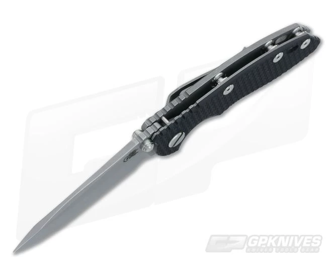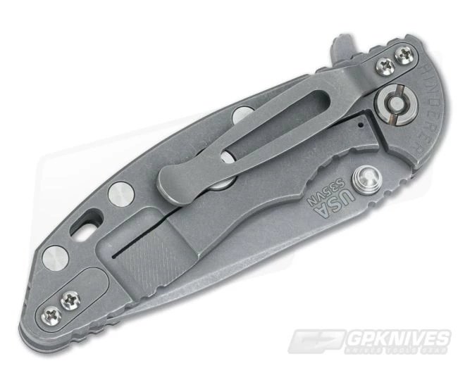 The Handle: Â Full titanium frame lock and liner have received the Working Finish treatment as well to match the blade. This finish works great for intended hard-use as it already looks “worn” or “broken in”…and cool. So, no-worry wear as you won’t be able to tell. Hardware and standoffs create one tough package while 3D texturing on the G-10 scale coupled with jimping all around create a solid grip. There is a bit of a choil to choke up on the blade for more detailed cutting tasks as well. This Hinderer XM-18 includes the famous Hinderer Lockbar Stabilizer and two-position titanium clip for tip up or down right hand carry.