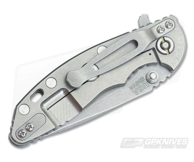 The Handle: The titanium frame lock and liner have received a fully worn in stonewashed finishing. Hardware and standoffs create one tough package while 3D texturing on the G-10 scale coupled with jimping all around create a solid grip. There is a bit of a choil to choke up on the blade for more detailed cutting tasks as well. This Hinderer XM-18 includes the famous Hinderer Lockbar Stabilizer and two-position titanium clip for tip up or down right hand carry.