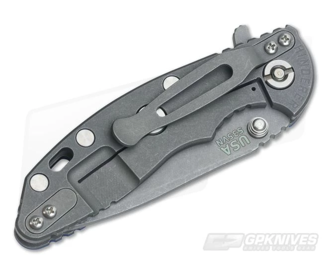 The Handle: Â Full titanium frame lock and liner have a Working Finish as well. This is a rugged and attractive finish that hides wear well over time. Hardware and standoffs create one solid package while 3D texturing on the G-10 scale coupled with jimping all around create a solid grip. There is also a bit of a choil to choke up on the blade for more detailed cutting tasks as well. This Hinderer XM-18 includes the famous Hinderer Lockbar Stabilizer and two-position Working Finish titanium clip and insert for tip up or down right hand carry.