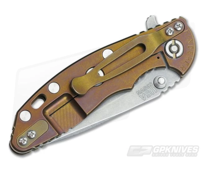 The Handle: Â Full titanium frame lock and liner have received the Bronze (Stonewash & Bronze Anodized) ano treatment for a one-of-a-kind effect. Hardware and standoffs create one tough package while 3D texturing on the G-10 scale coupled with jimping all around create a solid grip. There is a bit of a choil to choke up on the blade for more detailed cutting tasks as well. This Hinderer XM-18 includes the famous Hinderer Lockbar Stabilizer and two-position titanium clip for tip up or down right hand carry.