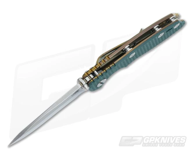 The Blade:Â Â The three inch blade has a fully stonewashed finish and can be opened via the integral flipper or dual thumb studs/blade stops. This one hides the wear and looks good doing it. Â Rick’s own 17-4PH state-of-the-art pivot system creates silky smooth operation; however, a bit of wrist action may be needed for flipping as Hinderers often have a light detent. Â