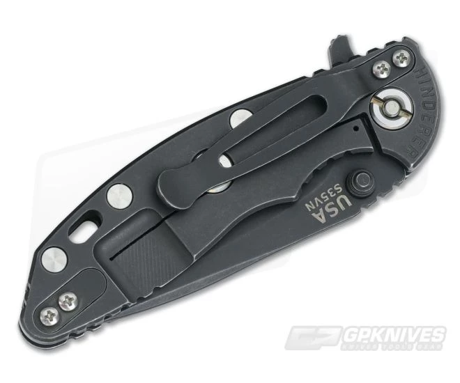 The Handle: Full titanium frame lock and liner have also received the Battle Black DLC treatment for a one-of-a-kind effect. Hardware and standoffs create one tough package while 3D texturing on the G-10 scale coupled with jimping all around create a solid grip. There is a bit of a choil to choke up on the blade for more detailed cutting tasks as well. This Hinderer XM-18 includes the famous Hinderer Lockbar Stabilizer and two-position matching DLC coated titanium clip for tip up or down right hand carry.