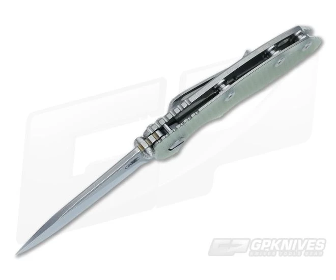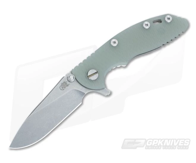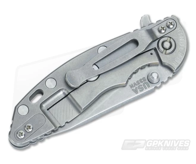 The Blade:Â Â The three inch blade has a full stonewashed finish and can be opened via the integral flipper or dual thumb studs/blade stops. Rick’s own 17-4PH state-of-the-art pivot system creates silky smooth operation; however, a bit of wrist action may be needed for flipping as Hinderers often have a light detent. Â