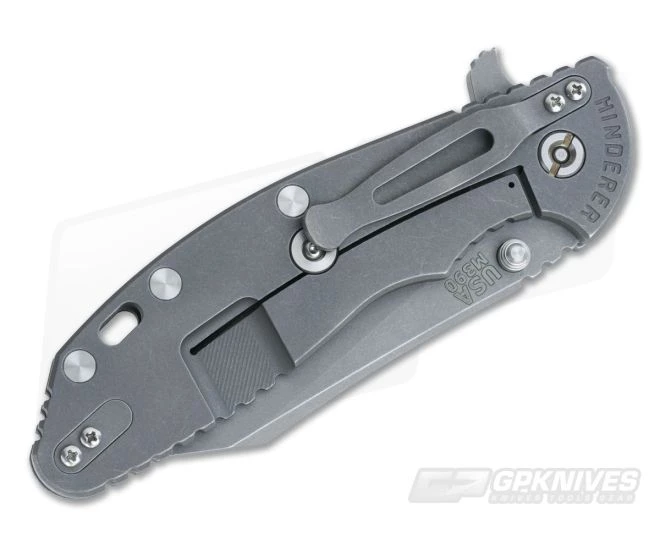 The Handle: This knife has a gray G10 front scale, with a titanium liner lying beneath. The rear side is solid CNC machined titanium with hefty jimping and a frame lock. Hinderer’s famous lock bar stabilizer or LBS is present, and a reversible tip up or down carry clip is attached. The XM-24 has open spine construction via barrel spacers and will provide years of guilt free use thanks to its fully Working Finished frame.