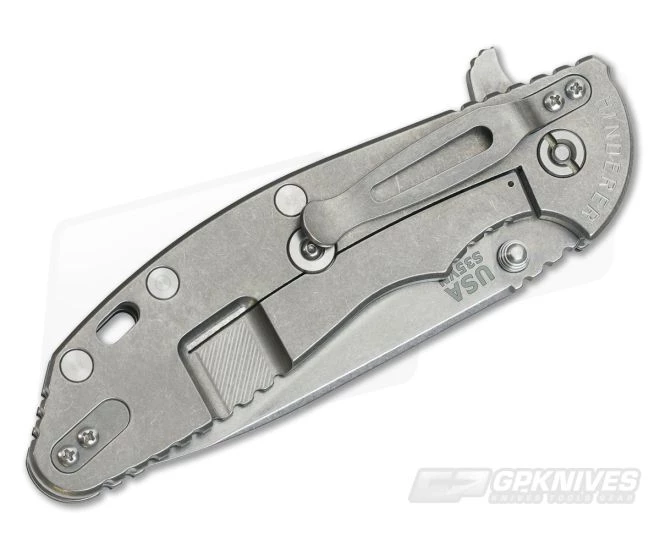 The Handle:Â This knife has an Black G10 front scale, with a titanium liner lying beneath. The rear side is solid CNC machined titanium which comprises the integral frame lock. Hinderer’s famous lock bar stabilizer or LBS is present, and a reversible tip up or down carry clip is attached. The XM-24 has open spine construction via barrel spacers and for ease of cleaning and maintenance. The liner, frame lock and pocket clip are all finished in the same rugged, stonewash finish as the blade with a machine satin on the back spacers..