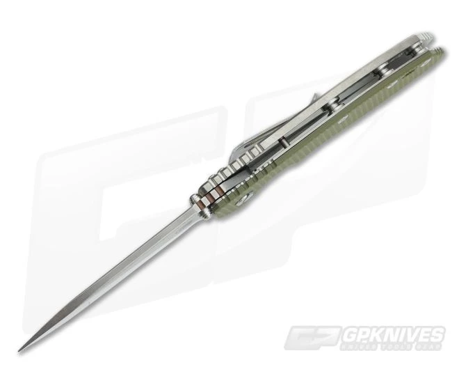 The Handle:Â This knife has an OD Green G10 front scale, with a titanium liner lying beneath. The rear side is solid CNC machined titanium which comprises the integral frame lock. Hinderer’s famous lock bar stabilizer or LBS is present, and a reversible tip up or down carry clip is attached. The XM-24 has open spine construction via barrel spacers and for ease of cleaning and maintenance. The liner, frame lock and pocket clip are all finished in the same rugged, stonewash finish as the blade with a machine satin on the back spacers..