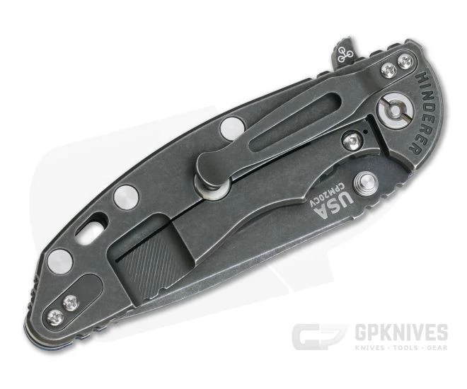 Handle:Â Full titanium frame lock and liner have a matching “Battle Black” finish that is rugged and hides wear well while still having a handsome appeal. Satin Hardware and Black DLC standoffs create one solid package while 3D texturing on the layered G10 scale coupled with jimping all around create a solid grip. There is also a bit of a choil to choke up on the blade for more detailed cutting tasks as well. This Hinderer XM-18 includes the famous Hinderer Lockbar Stabilizer and two-position titanium clip and insert for tip up or down right-hand carry.