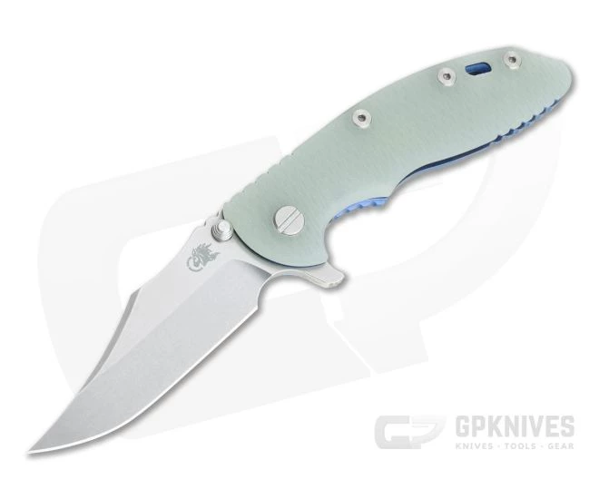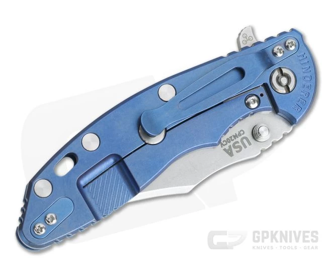 Handle:Â Full titanium frame lock and liner have a matching blue anodized stonewashed finish that hides wear while retaining a striking visual appeal. Satin Hardware and standoffs create one solid package while a 3D textured G10 scale coupled with strategically placed jimping provides a solid grip. A blade choil allows for a more forward grip for controlled work. Additional features include the Hinderer Lockbar Stabilizer, titanium clip insert and customizable modular design.