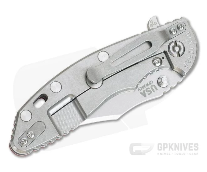 Handle:Â Full titanium frame lock and liner have a matching stonewashed finish that hides wear while retaining a striking visual appeal over time. Satin Hardware and standoffs create one solid package while a 3D textured G10 scale coupled with strategically placed jimping provides a solid grip. A blade choil allows for a more forward grip for controlled work. Additional features include the Hinderer Lockbar Stabilizer, titanium clip insert and customizable modular design.