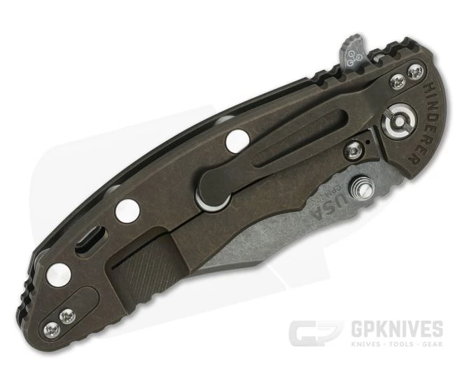 Handle: Full titanium frame lock and liner are matching Battle Bronze (anodized Working Finish) for a rugged, wear hiding look with stunning visual appeal. Satin Hardware and standoffs create one solid package while a 3D textured G10 scale coupled with strategically placed jimping provides a solid grip. A blade choil allows for a more forward grip for controlled work. Additional features include the Hinderer Lockbar Stabilizer, titanium clip insert and customizable modular design.