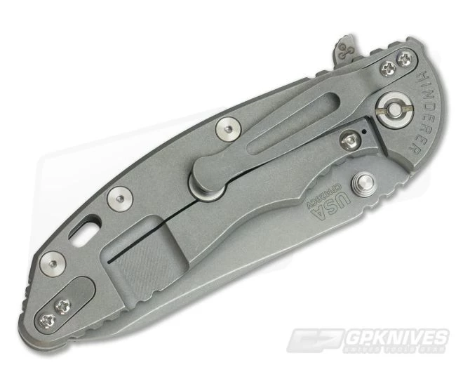 Handle: Full titanium frame lock and liner have a matching Working Finish that is rugged and hides wear well while still having a handsome appeal. Satin Hardware and standoffs create one solid package while 3D texturing on the G10 scale coupled with jimping all around create a solid grip. There is also a bit of a choil to choke up on the blade for more detailed cutting tasks as well. This Hinderer XM-18 includes the famous Hinderer Lockbar Stabilizer and two-position titanium clip and insert for tip up or down right hand carry.